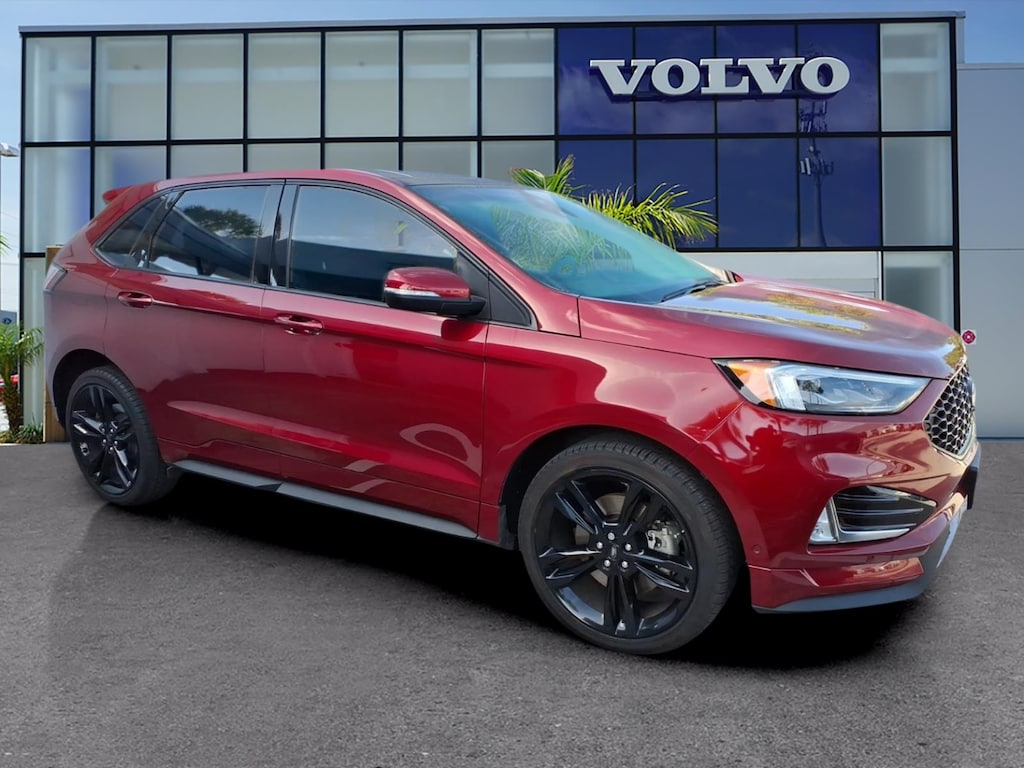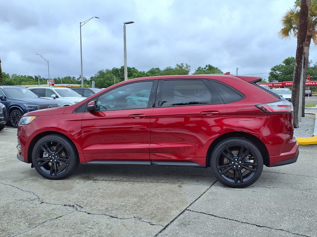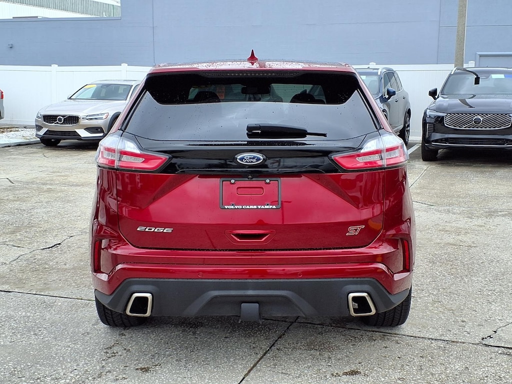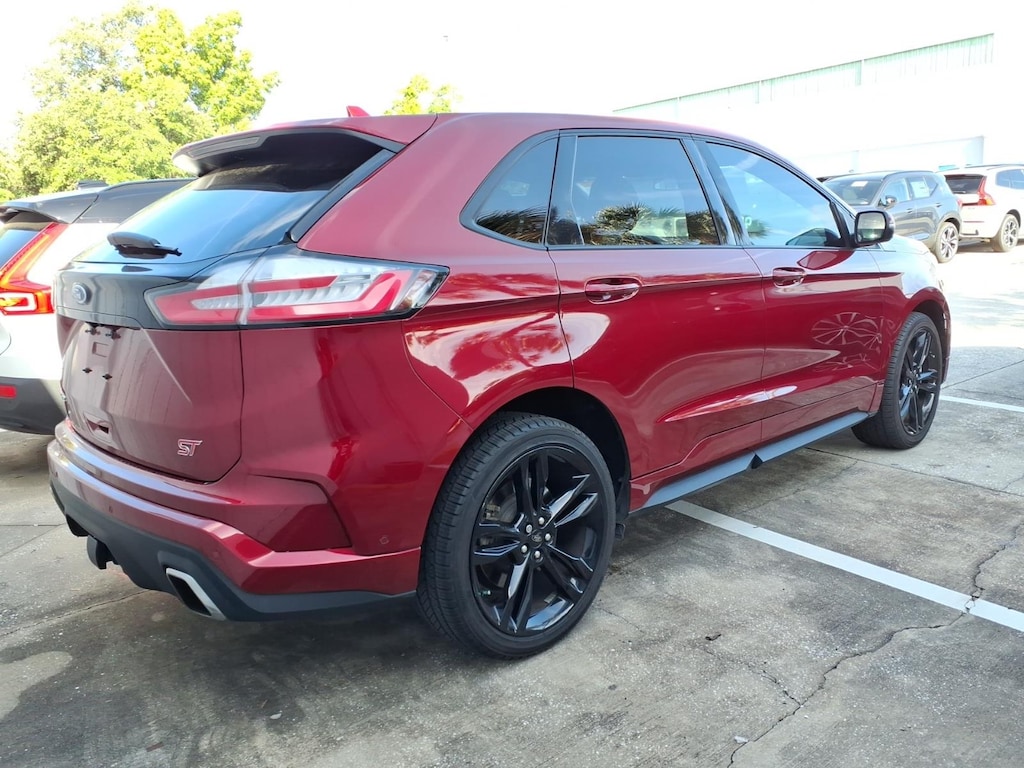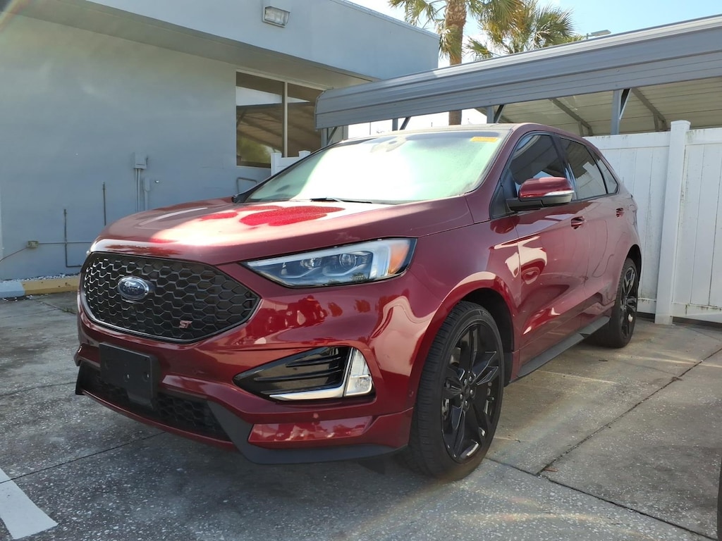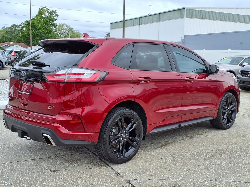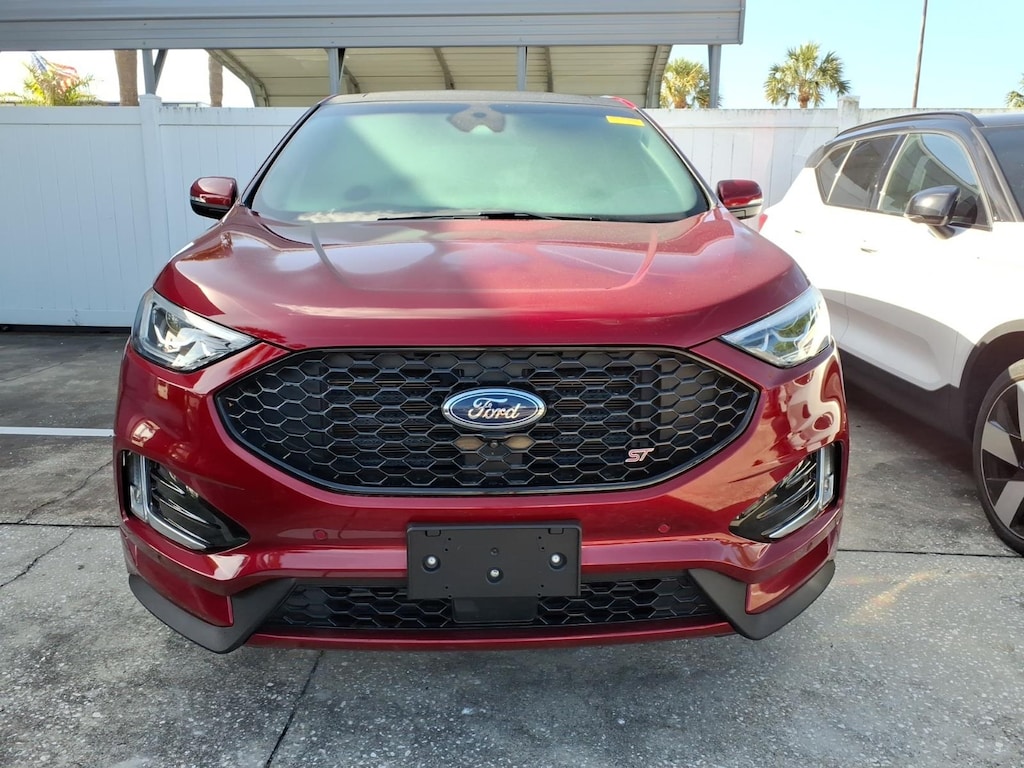 Clean CARFAX. CARFAX One-Owner. 110V/150W AC Power Outlet, 12 Speakers, 4-Wheel Disc Brakes, ABS brakes, Adaptive Cruise Control w/Stop & Go, Adaptive LED Headlamps, Air Conditioning, Alloy wheels, AM/FM radio: SiriusXM, AppLink/Apple CarPlay and Android Auto, Auto High-beam Headlights, Auto tilt-away steering wheel, Auto-Dimming Driver's Sideview Mirror, Auto-dimming Rear-View mirror, Automatic temperature control, Axle Ratio: TBA, Brake assist, Bumpers: body-color, CD player, Compass, Cooled Front Seats, Delay-off headlights, Driver door bin, Driver vanity mirror, Dual front impact airbags, Dual front side impact airbags, Electronic Stability Control, Emergency communication system: SYNC 3 911 Assist, Enhanced Active Park Assist, Equipment Group 401A, Evasive Steering Assist, Foot-Activated Hands-Free Liftgate, Four wheel independent suspension, Front 180 Degree Camera, Front anti-roll bar, Front Bucket Seats, Front Center Armrest w/Storage, Front dual zone A/C, Front fog lights, Front reading lights, Fully automatic headlights, Heated door mirrors, Heated front seats, Heated Rear-Seats, Illuminated entry, Knee airbag, Lane Centering, Leather-Trimmed Heated ST Bolstered Bucket Seats, Low tire pressure warning, Memory seat, Occupant sensing airbag, Outside temperature display, Overhead airbag, Overhead console, Panic alarm, Panoramic Vista Roof, Passenger door bin, Passenger vanity mirror, Perimeter Alarm, Power door mirrors, Power driver seat, Power Liftgate, Power passenger seat, Power steering, Power windows, Radio: B&O Sound System by Bang & Olufsen, Rain sensing wipers, Rear anti-roll bar, Rear Parking Sensors, Rear reading lights, Rear seat center armrest, Rear window defroster, Rear window wiper, Remote keyless entry, Remote Start System, Roof rack: rails only, SiriusXM Radio, SiriusXM Traffic & Travel Link, Speed control, Speed-Sensitive Wipers, Split folding rear seat, Spoiler, Steering wheel memory, Steering wheel mounted audio controls, SYNC 3 Communications & Entertainment System, Tachometer, Telescoping steering wheel, Tilt steering wheel, Traction control, Trip computer, Turn signal indicator mirrors, Universal Garage Door Opener (UGDO), Variably intermittent wipers, Voice-Activated Touchscreen Navigation System, Wheels: 20 Bright-Machined Aluminum, Wheels: 21 Premium Gloss Black-Painted Aluminum, Wireless Charging Pad. 2019 Ford Edge ST 2.7L V6 EcoBoost AWD 8-Speed Automatic Ruby Red